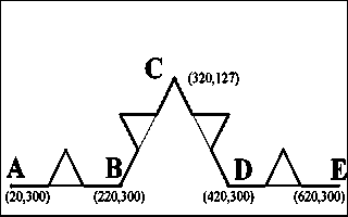 Построим IFS для "дракона" Хартера-Хейтуэя. Для этого расположим первое поколение этого фрактала на сетке координат дисплея 640 x 350 (Рис.5). Обозначим точки получившейся ломаной A, B, C. По правилам построения (раздел 2.1) у этого фрактала две части, подобные целому - на рис.5 это ломаные ADB и BEC. Зная координаты концов этих отрезков, можно вычислить коэффициенты двух аффинных преобразований, переводящих ломаную ABC в ADB и BEC: